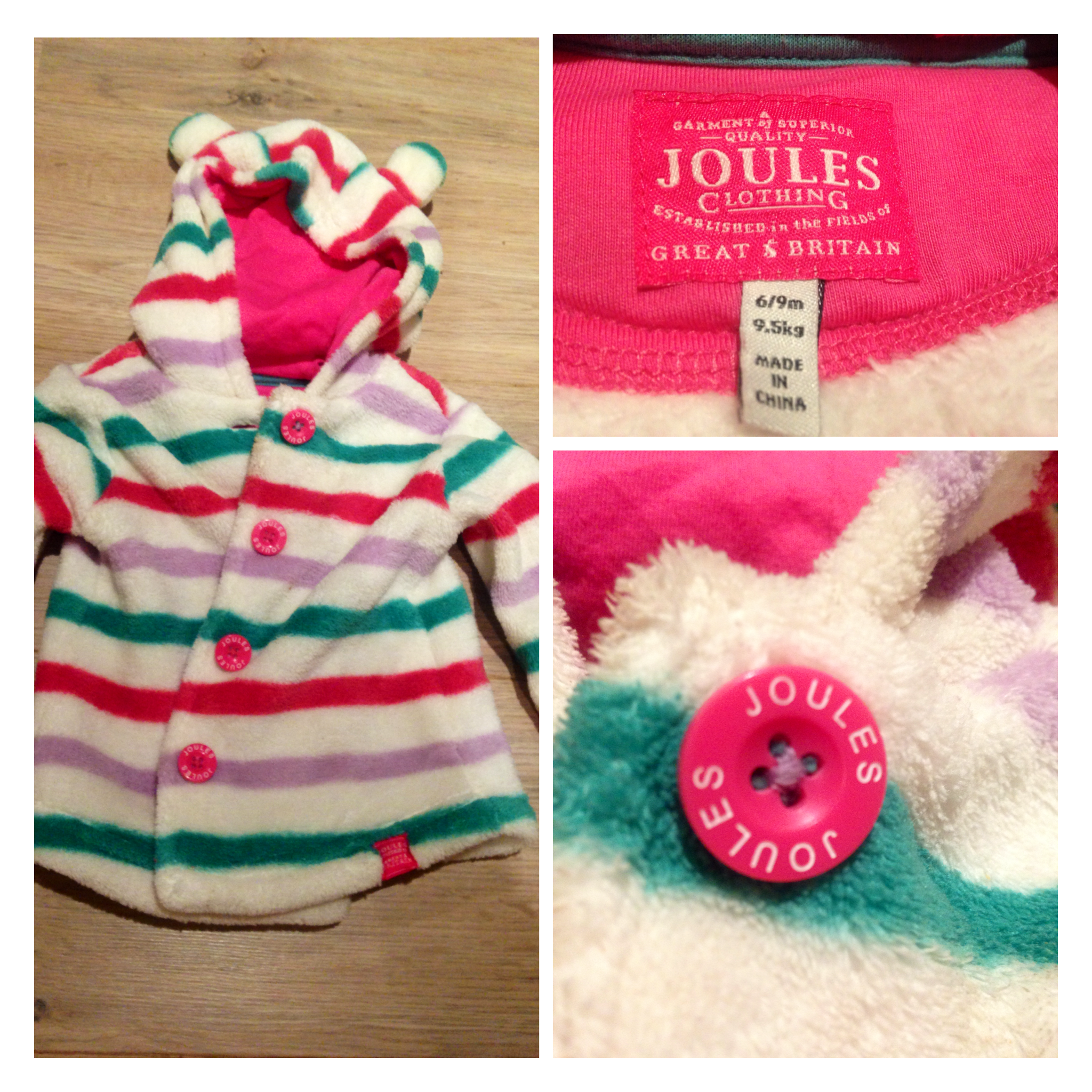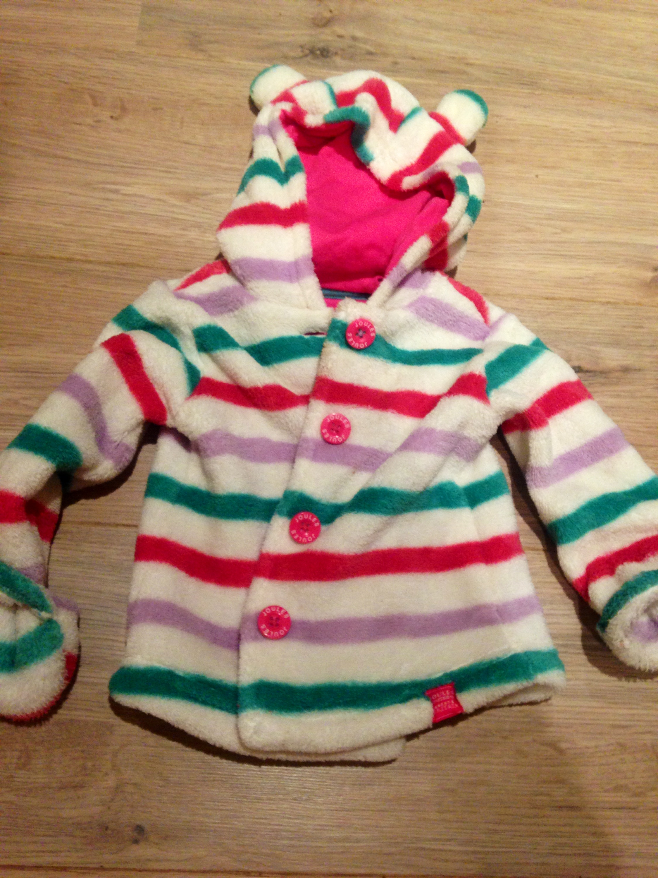 With gorgeous soft fleece fabric, nice pink chunky buttons and cute wee ears on the hood it’s a winner!